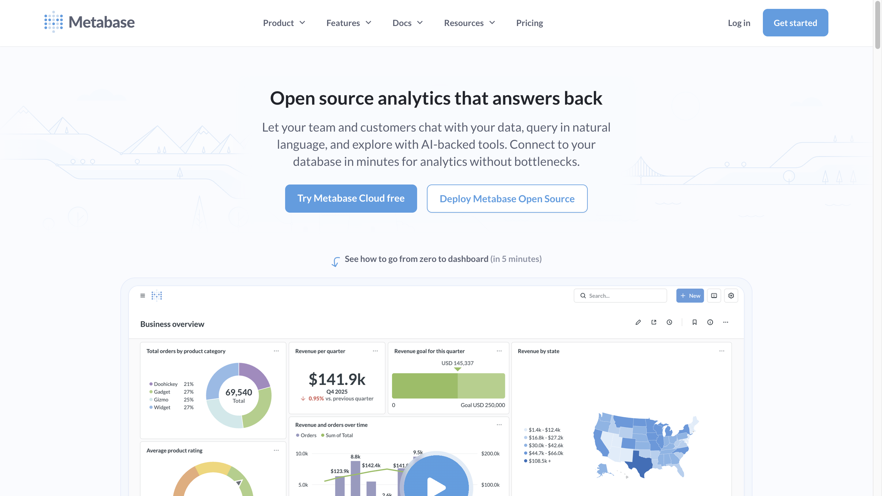 Metabase sits at the opposite end of the BI cost spectrum from everything else on this list — it's open source, self-hostable, and free for the core product. Founded in 2014, it became the default BI tool for engineering-led startups for one reason: zero licensing cost and a visual query builder non-technical users could actually pick up. For teams comparing Power BI's $14/user/month to zero dollars, the math rewrites the evaluation.
