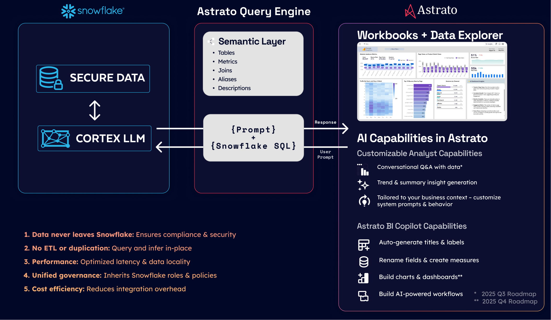 Astrato now supports native integration with Snowflake Cortex LLM, giving you direct access to AI-powered insights — without moving a single row of data.