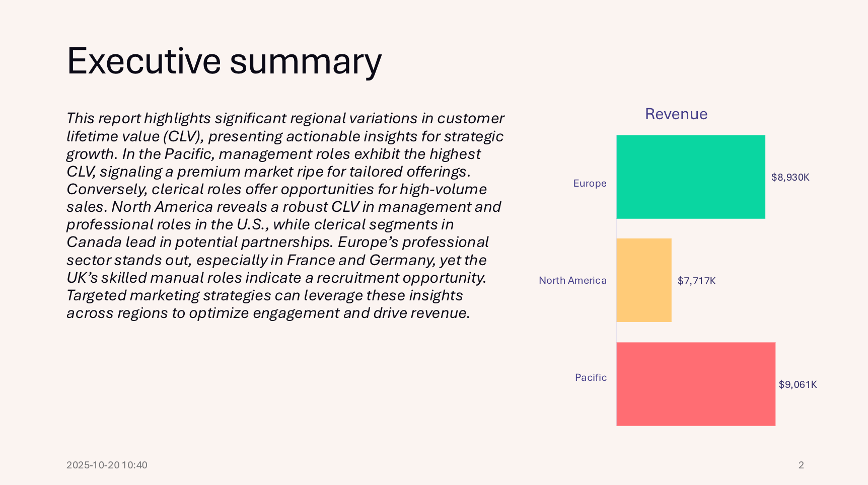 - Executive-ready insights that can be embedded into scheduled reports or PowerPoint exports